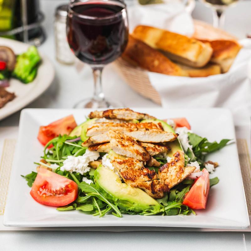 Tomato, onions, avocado, walnuts, feta cheese, and grilled chicken.