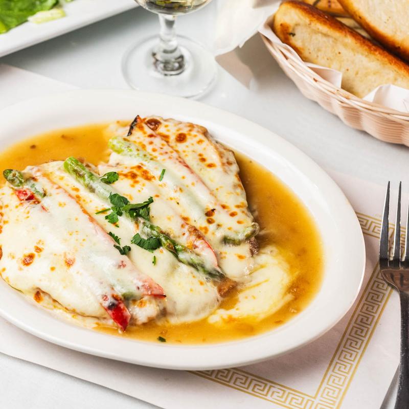 Lightly battered, layered with asparagus and melted mozzarella cheese in a lemon wine sauce.