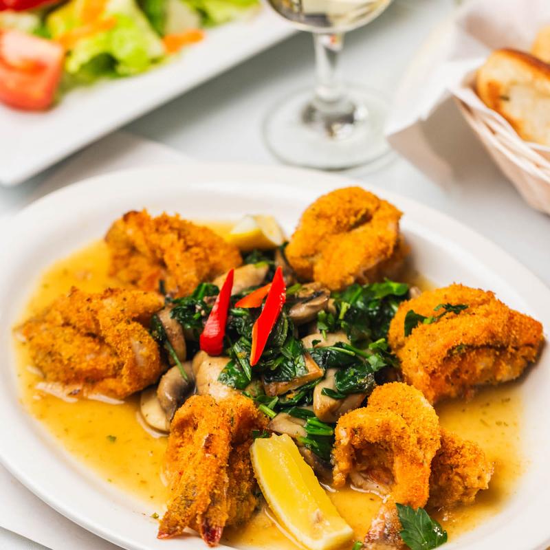 Lightly battered and simmered in lemon butter and white wine sauce.